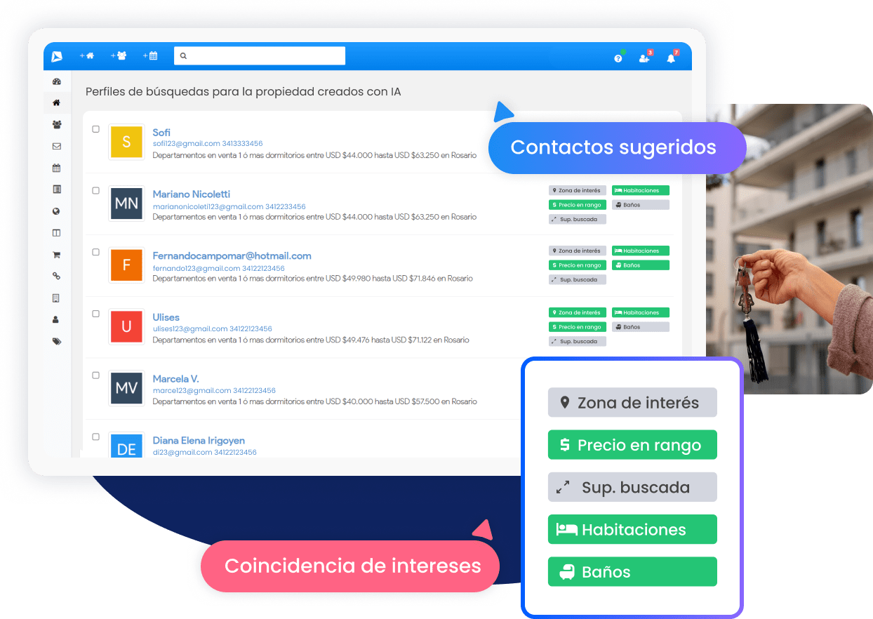 KiteProp analiza y combina toda la información del sistema y construye perfiles de búsqueda en base a los intereses del contacto. Cuando consultan sobre una determinada propiedad, se genera un perfil de busqueda con esos valores dentro de un umbral de precio máximo y mínimo, y un área de búsqueda extendida. Al generarse estas coincidencias, aumentan las oportunidades de venta.